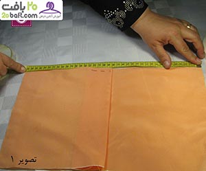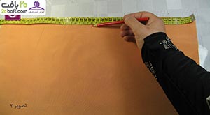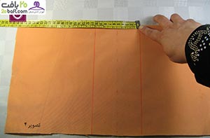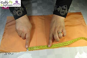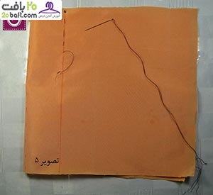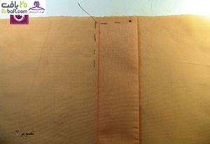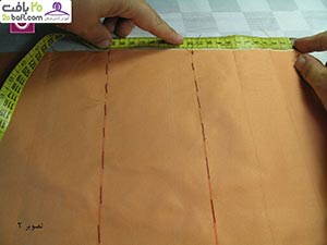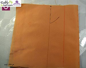 دومین مرحله: پارچه را از قسمت نقطه چین تا می زنید و در فاصله ی 10سانتیمتری آن را کوک می زنید. سپس روی آن را به اندازه ی دلخواه با چرخ خیاطی، می دوزید.