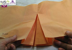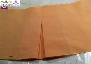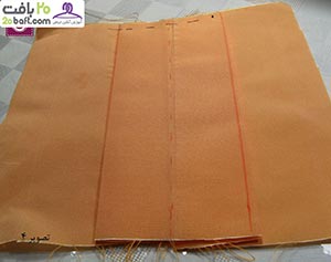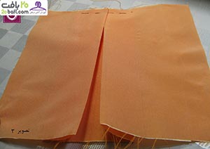 سومین مرحله: اکنون درز را اتو کرده و پارچه را باز می کنید و از محل نقطه چین که وسط قرار دارد به داخل فشار می دهید، طوری که دو پیلی در دو طرف ایجاد شود ( مطابق تصویر). توجه داشته باشید که دو خط در دو طرف قرار بگیرد. سعی کنید چند کوک هم در قسمت بالای پیلی بزنید تا پیلی در جای خود ثاب بماند.