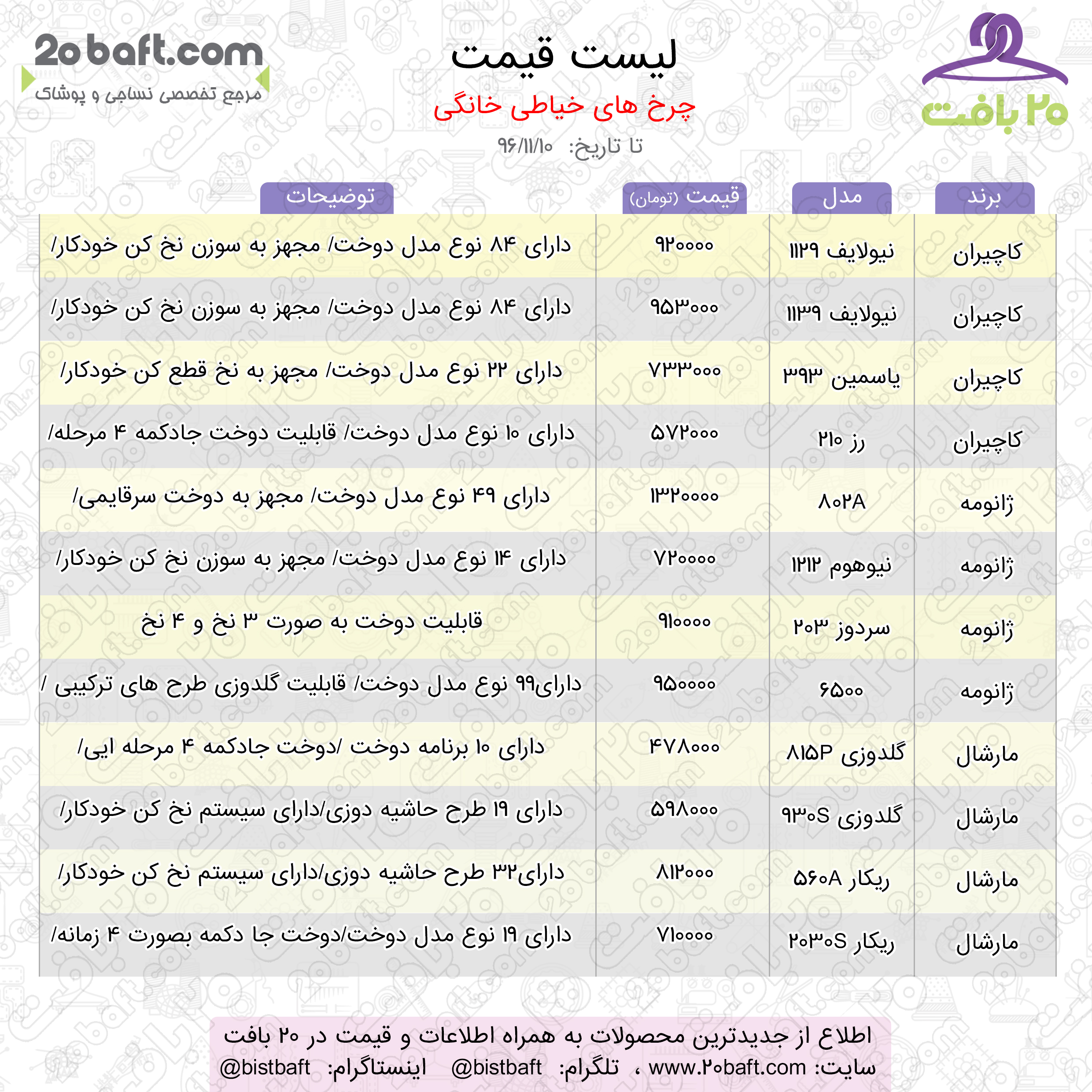 با توجه به اینکه شرکت 20 بافت تنها مرجع تخصصی ماشین آلات و ملزومات دوخت می باشد در نظر دارد برای اطلاع مشتریان بروزترین قیمت انواع چرخ خیاطی را خدمت شما بزرگواران ارائه دهد